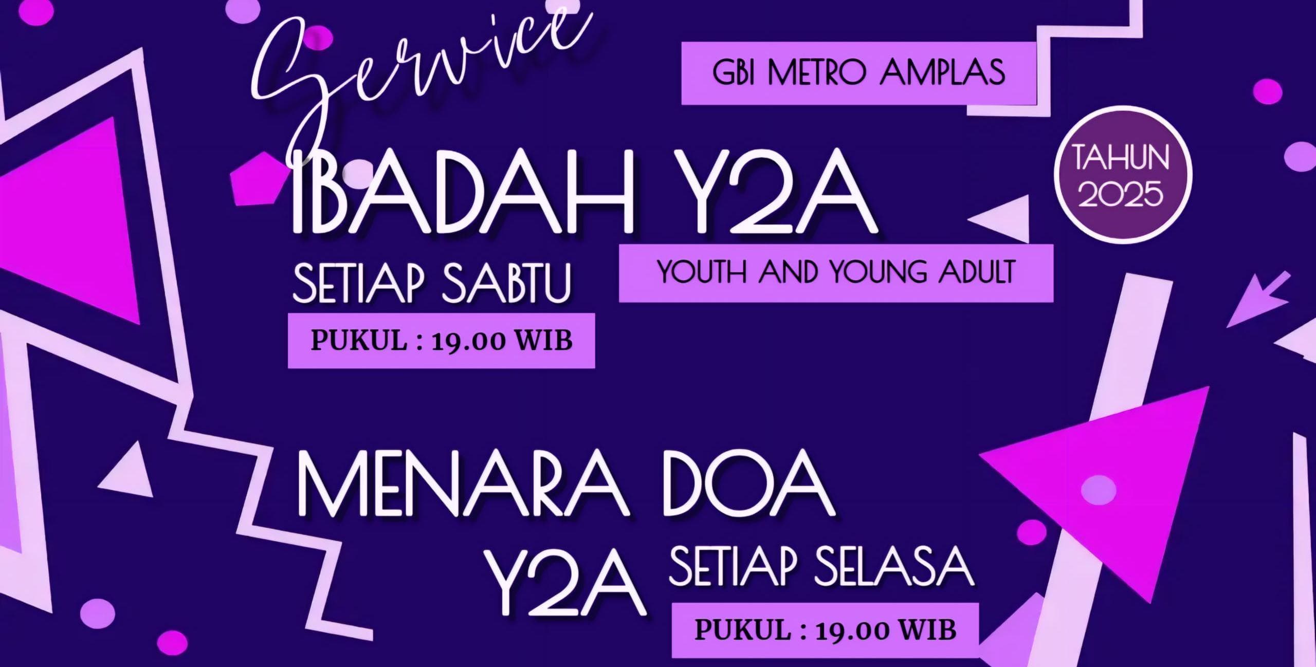Ibadah Y2A merupakan singkatan dari Youth & Young Adult. Secara usia, Pemuda dikategorikan berusia 18 - 24 tahun, sedangkan Dewasa Muda berusia 25 - 43 tahun. Ibadah ini didedikasikan untuk orang-orang muda sebagai wadah yang diberikan Gereja untuk mereka mengekspresikan cinta dan kekaguman kepada Tuhan.